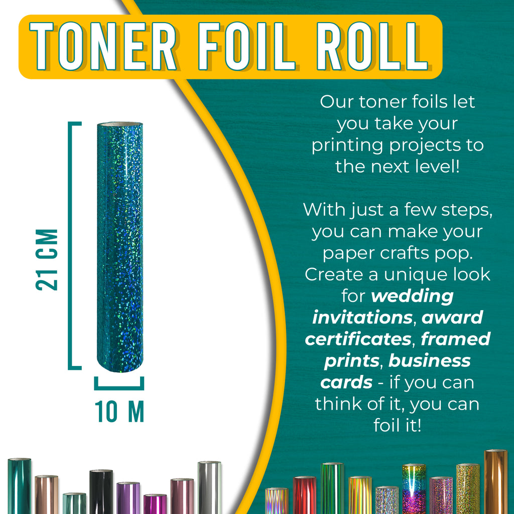 Colour: Blue Glitter • Type: Toner-reactive foil • Size: 21 cm × 10 m • Compatibility: Toner prints • Precision Foil Pro