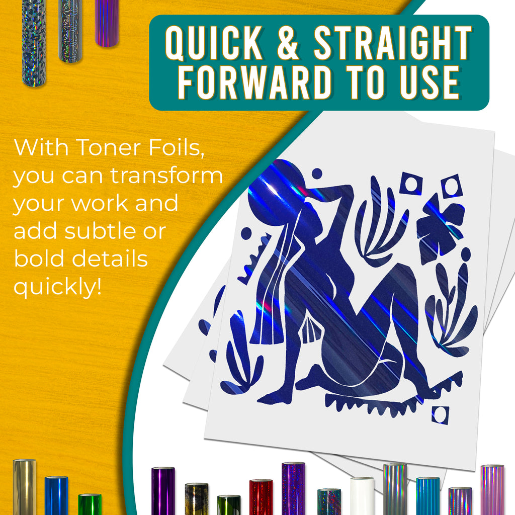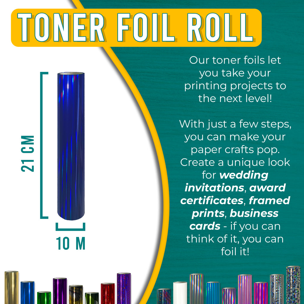 Colour/Finish: Holographic Blue • Type: Toner-reactive foil • Size: 21 cm × 10 m • Compatibility: Toner prints • Precision Foil Pro