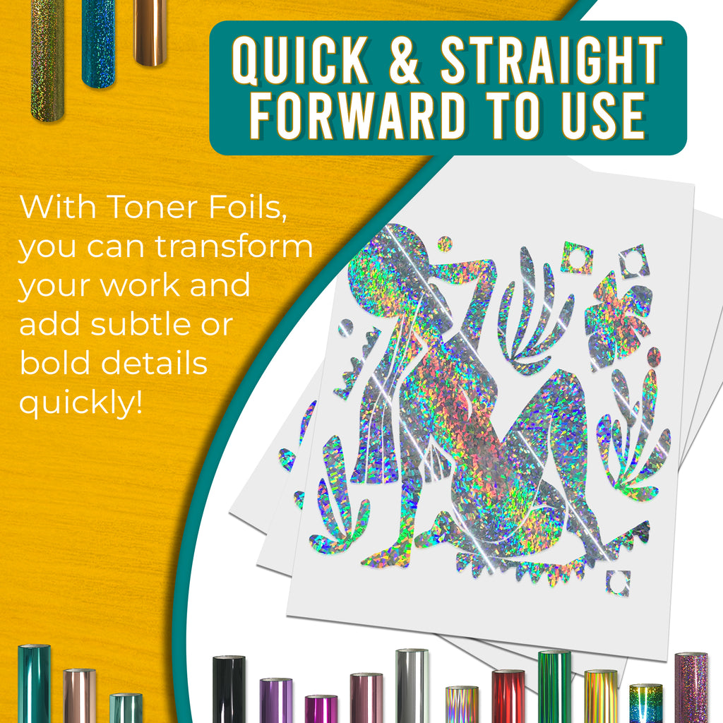 Colour: Silver Glitter • Type: Toner-reactive foil • Size: 21 cm × 10 m • Compatibility: Toner prints • Precision Foil Pro